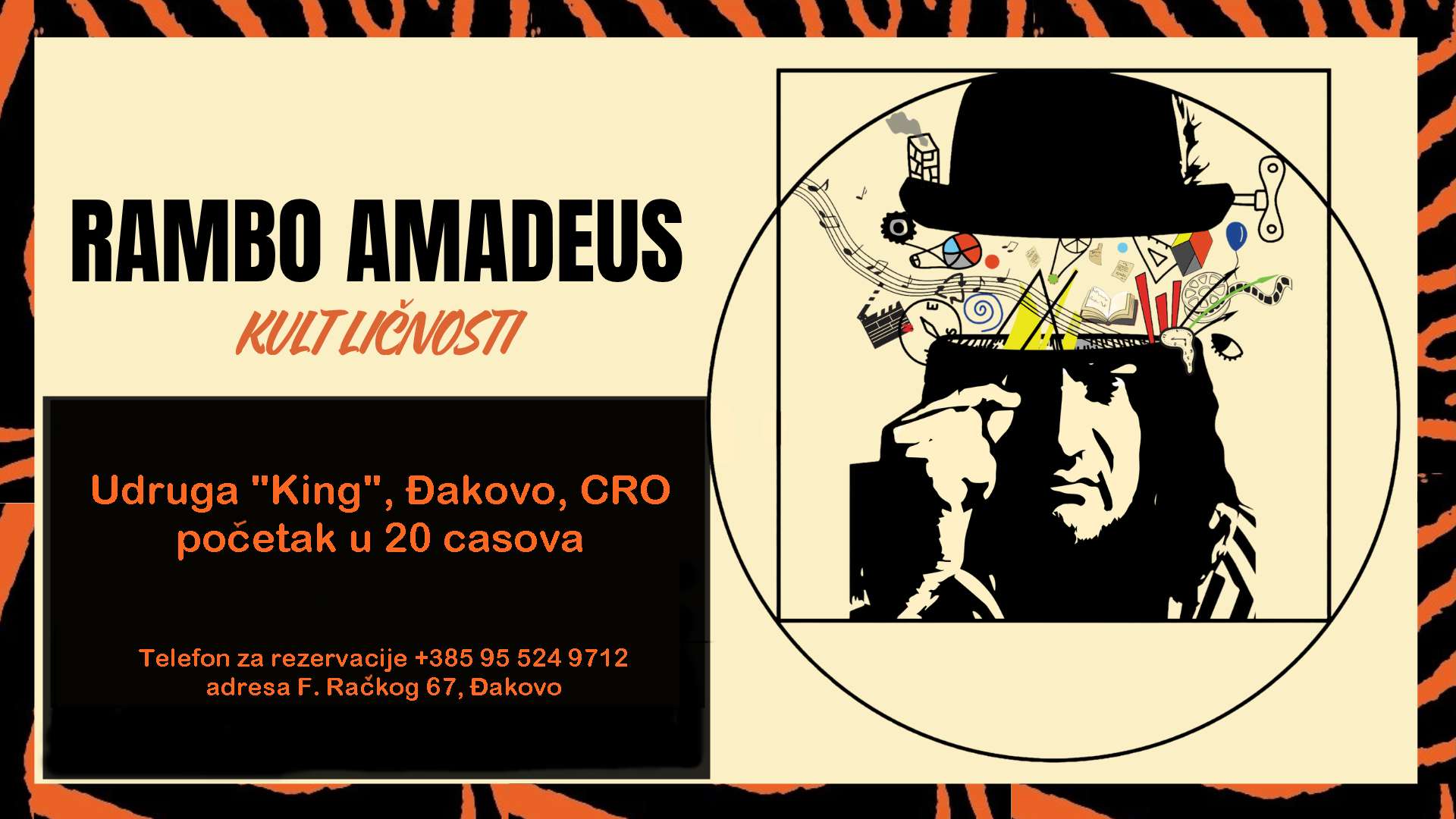 U prostoru Udruge za promicanje urbane kulture „KING“ u Đakovu, CRO, Rambo Amadeus i bend će održati koncert s početkom od 20 časova.